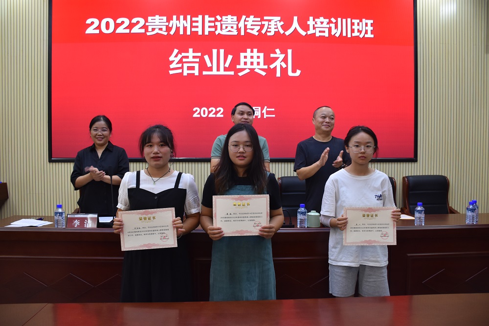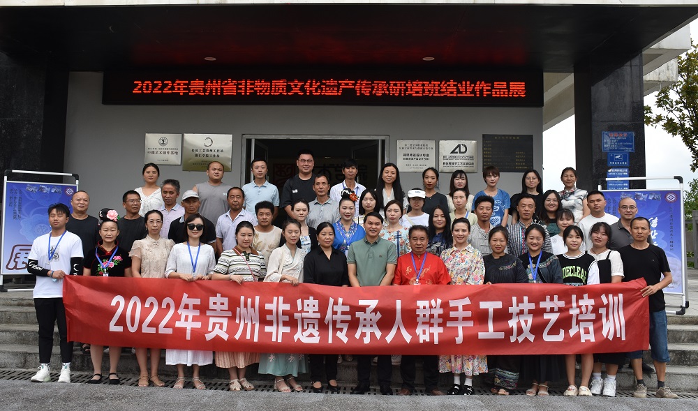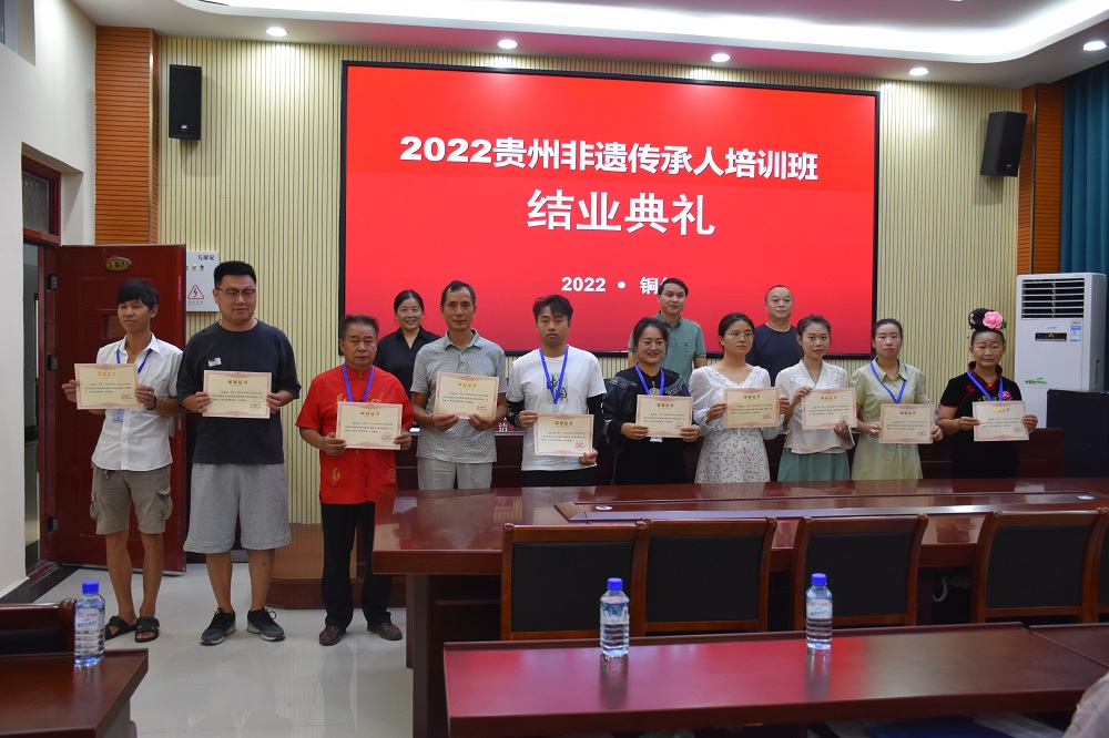 8月28日,由贵州省文化和旅游厅主办、铜仁市文体广电旅游局协办、beat365承办的2022年贵州省非物质文化遗产传承人群手工技艺培训班结业典礼在艺术学院举行。艺术学院党委书记徐美、院长李洁、副院长龙庆华,艺术学院非遗工作站教师,培训班全体学员参加典礼。