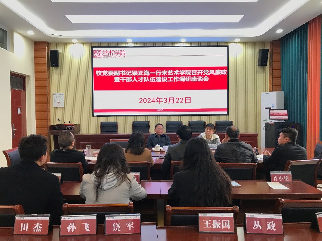 2024年3月22日,校党委副书记梁正海到艺术学院调研党风廉政暨干部人才队伍建设工作并召开座谈会。艺术学院党委班子及各科室负责人参加会议。