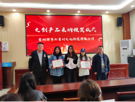 在贵州省博物馆文创设计项目中,三位同学的设计方案因创意与市场价值兼备,被该公司采纳并打样。公司领导专程到校颁发证书与奖品,以示鼓励。
