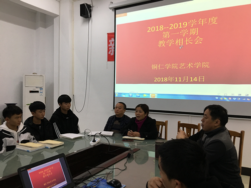 2018年11月14日下午,艺术学院教学相长会在美术楼会议室召开,会议由艺术学院院长李洁主持,教务科科长戴腾、美术系主任龙庆华、音乐系主任罗亚琴、教学秘书徐秋逸参加会议并讲话。