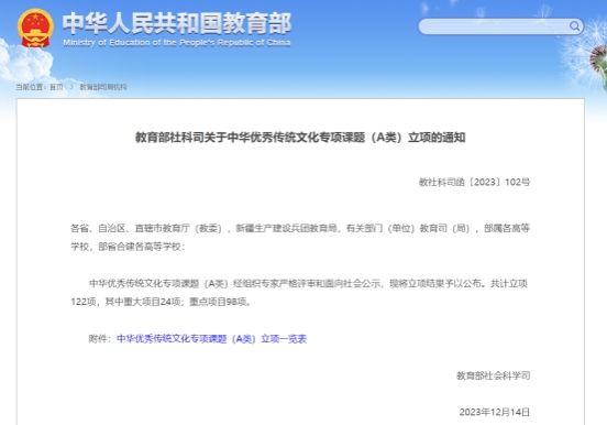 12月14日,《教育部社科司关于中华优秀传统文化专项课题(A类)立项的通知》(教社科司函〔2023〕102号)公布,我院教师曹万平申报的《各民族鸡骨卜图谱搜集与比较研究》(项目编号:23JDTCA075)获得重点项目立项。