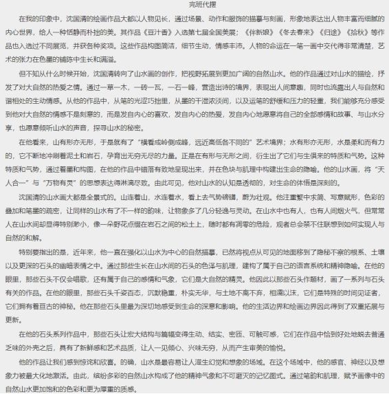 文章中,完班代摆先生以沈国清人物画的细腻生动、恬静拙朴特征为印象铺垫,分析总结了沈国清山水画以繁中求简、写意赋形的笔法,以对色彩叠加、笔墨疏密的高超把控,在他无形见有形,有形见无形,至柔成至刚,刚硬茹柔美的艺术境界点化下,山水一气自生磅礴,人迹一到情满山河,山水无限,人物有数,启发天人之思,自然之道。所以虽说山水无言,但在沈国清的山水世界中,却是万物有灵,万象有生, 诗意的山水满溢着人间的意趣,人间的意趣就是山水的诗意,中国哲学的天人合一,不过如此,最美的人间就是如此。