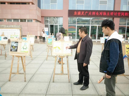 为了贯彻党的十九大精神,提升学生环保意识,营造绿色校园文化氛围,艺术学院首届开展了绿色环保海报设计大赛。于2017年11月22日在图书馆广场展览了64幅绿色环保设计作品,此次活动由艺术学院社团联合会发起,各个学院都非常积极的参与进来,特邀嘉宾评委张绍涛。展览通过新鲜的展览理念和创新的展览手段,展现大学生浓厚的创作热情,新锐独到的创作理念以及积极向上的党的十九大精神。展览期间,党总支书记崔德虎,团总支书记张绍涛老师前来参观,并对此次展览给予高度的评价,同时还吸引了大量的学生驻足观看。海报类的选手们根据自己的所设计的海报将环保理念诠释的淋漓尽致,许多作品都赢得了评委的青睐。其中,最佳创意奖一名,一等奖一名,二等奖三名,三等奖五名,优秀奖十一名。