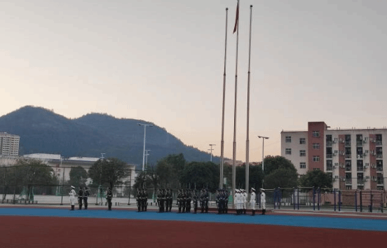 迎着朝阳,升旗仪式在主持人的宣讲下正式开始,国旗护卫队成员迈着铿锵的步伐来到了国旗台下,全场一片肃静。在激昂的《义勇军进行曲》中,升旗手振臂一挥,鲜艳的五星红旗徐徐展开,在初升的阳光映照下、师生的注目中,迎着初升的太阳,在晨曦中迎风飘扬在上空。