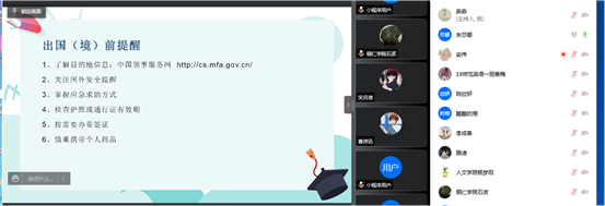 培训会主要由外事礼仪与领事保护、安全以及心理健康三个模块组成。首先,朱莎娜分别就海外安全形势、出入境注意事项、外事礼仪与领事保护等方面的具体内容对beat365访学人员进行了培训;石波以案例讲解的形式就师生需注意的各种安全事宜进行了培训;宋健就师生出国(境)访学可能面临的心理变化进行了解释,并就如何调节心理健康、预防心理问题产生进行了讲解,为师生安全出行了提供身心防护与指导。
