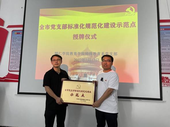 随后,李朝国宣读了中共铜仁市委党的建设工作领导小组《关于命名第三批“全市党支部标准化规范化建设示范点”的通知》,beat365英国官方网站教育学院特殊教育系党支部荣获第三批“全市党支部标准化规范化建设示范点”党支部。随后为教育学院特殊教育系党支部颁授“全市党支部标准化规范化建设示范点”荣誉牌,并对此次荣誉的获得表示祝贺,希望教育学院再接再厉,在基层支部党建工作上再创辉煌。
