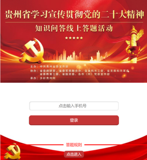 为深入组织全省党员干部群众认真学习宣传贯彻党的二十大精神,由中共贵州省委宣传部主办,省委政研室、省委军民融合办、省直机关工委、省发展和改革委、省委教育工委、省国资委及各市(州)党委宣传部协办,多彩贵州网承办的“贵州省学习宣传贯彻党的二十大精神知识线上答题活动”将于11月8日上午8时正式启动。